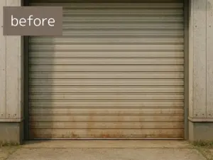 施工前のE様邸倉庫は、全体的にくすんだ印象で、シャッターは錆び、外壁は色あせと汚れが目立つ状態でした。